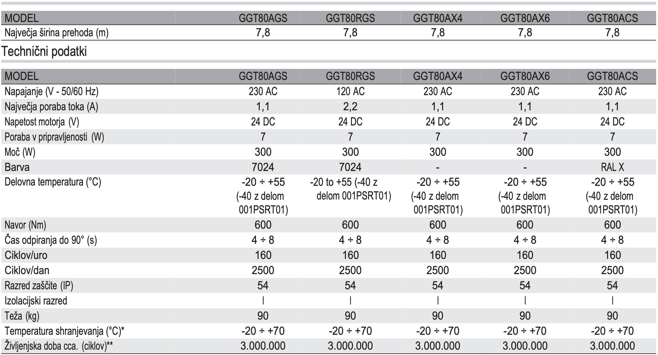 Tehnične značilnosti zapornice Came GT8: